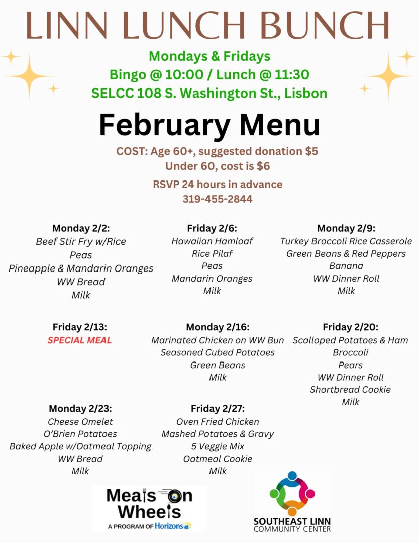 Through the Meals on Wheels program, SELCC provides hot meals every weekday to seniors in Lisbon and Mount Vernon. The nutritious meals are prepared by Horizons in Cedar Rapids and delivered by SELCC volunteers between 11:15am and 12:15pm. Participants receive a well-balanced meal and the security of knowing someone will be checking in each day.